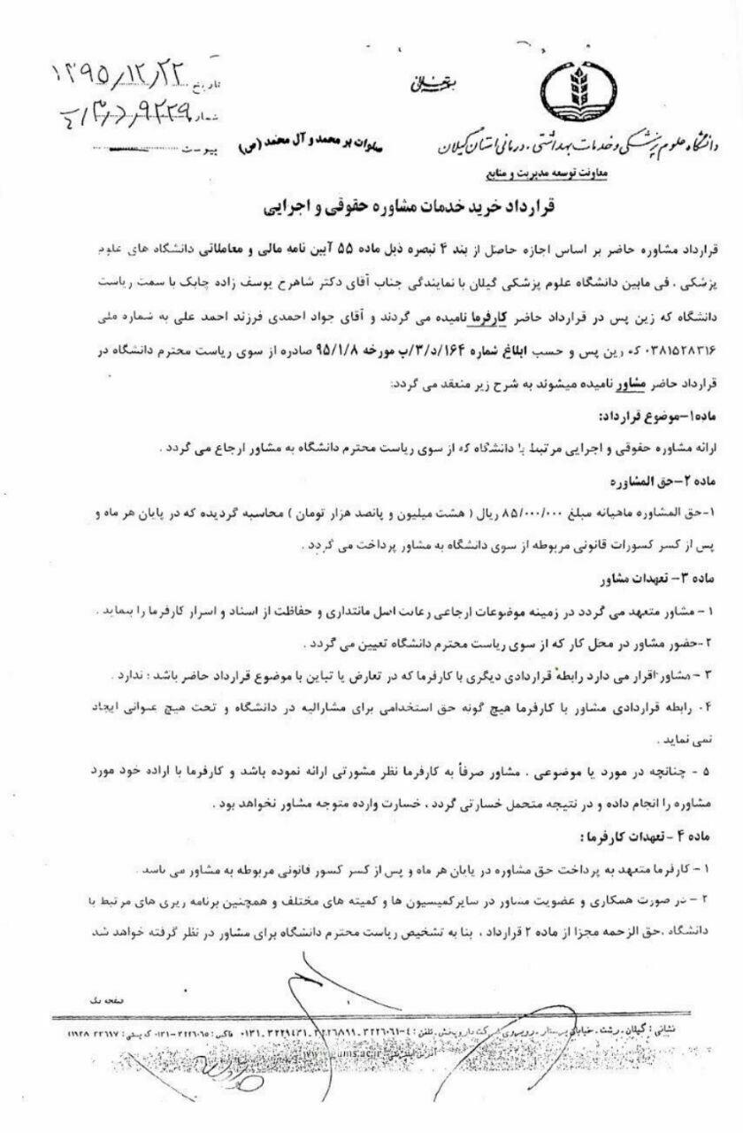 سند زیر صفحه اول قرارداد مشاوره جواد احمدی را نشان میدهد. قابل تامل آن که مبلغ حق المشاوره در این قرارداد ماهیانه ۸۵ میلیون ریال در نظر گرفته شده است! البته نظریهای وجود دارد که در آن گفته میشود وی علاوه بر این، ۲۵ میلیون ریال هم تحت عنوان حق مدیریت دریافت مینموده!